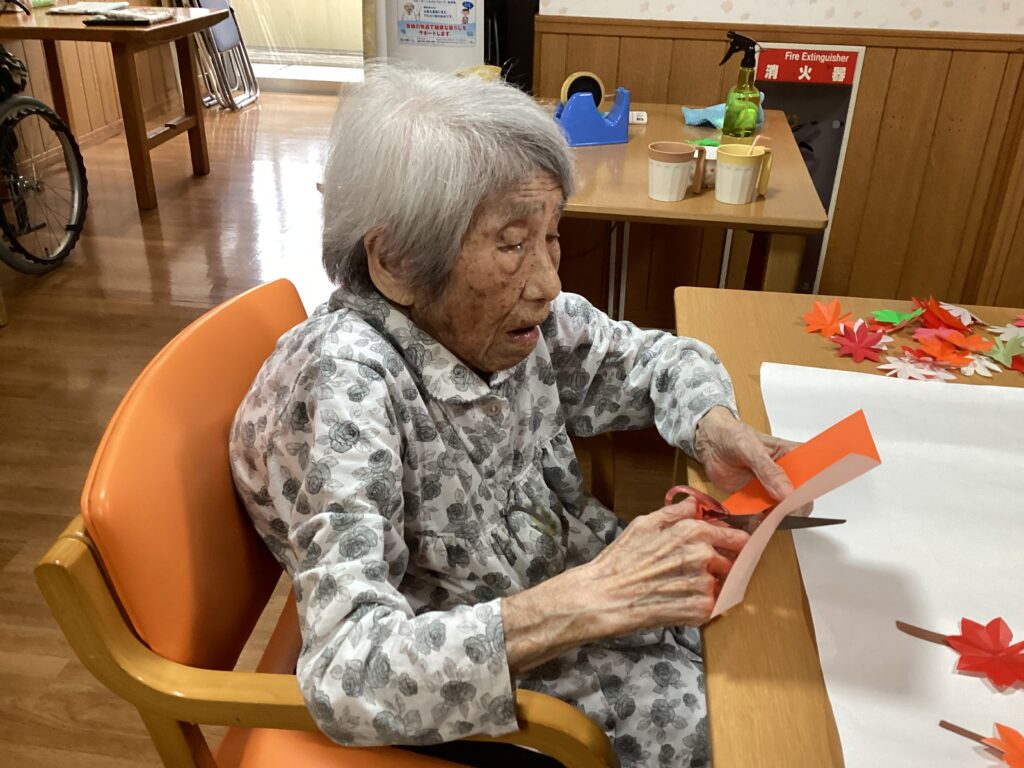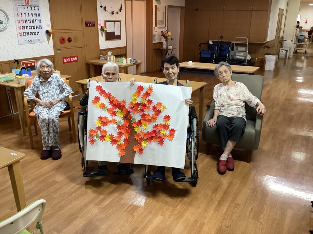 このたび、特別養護老人ホームゆうとぴあでは、皆様で折り紙の紅葉を作り、模造紙に張り付けた大きな木に飾り付けを行いました。
