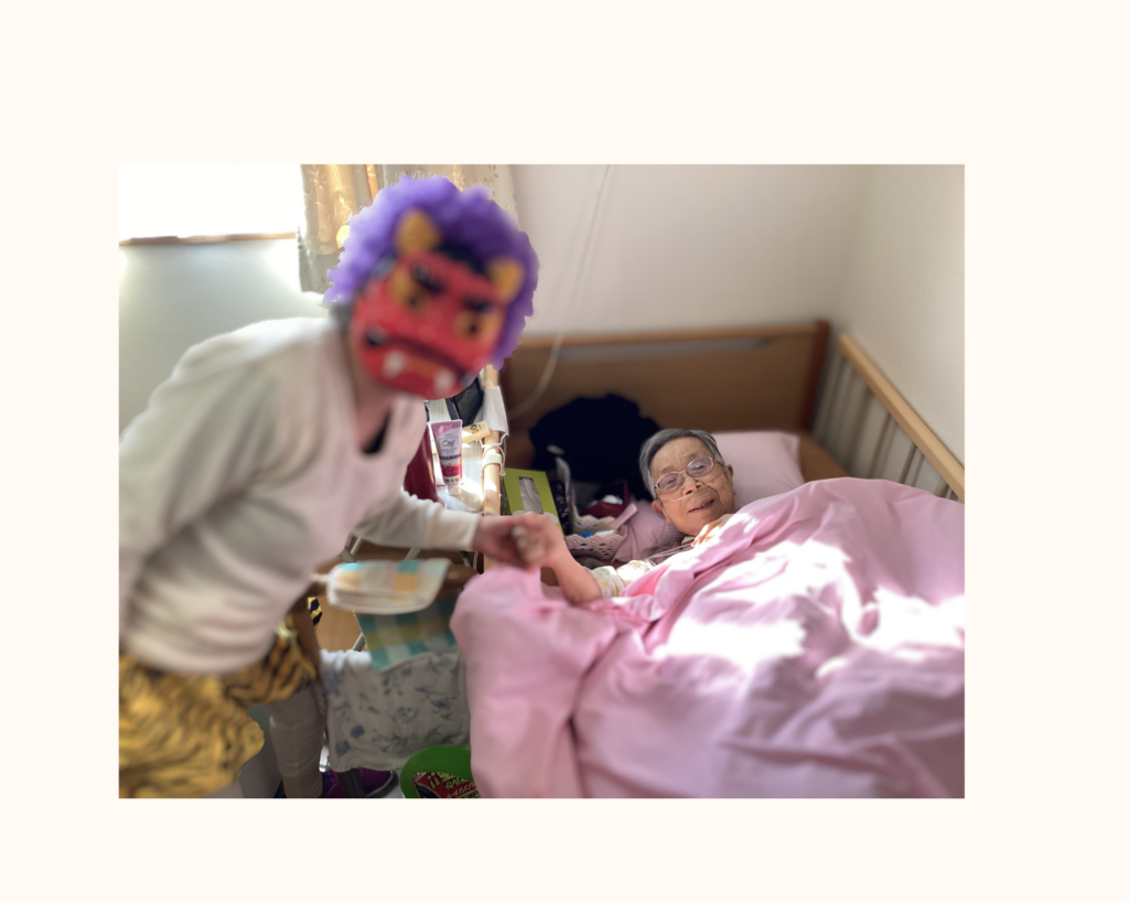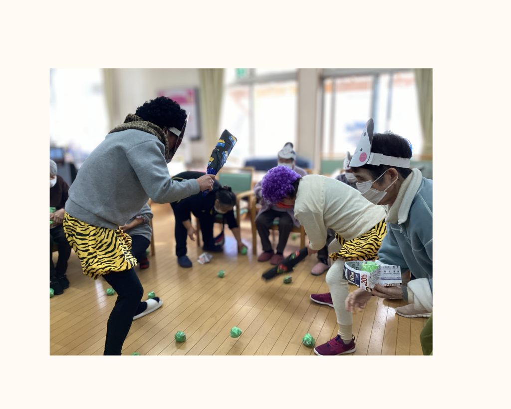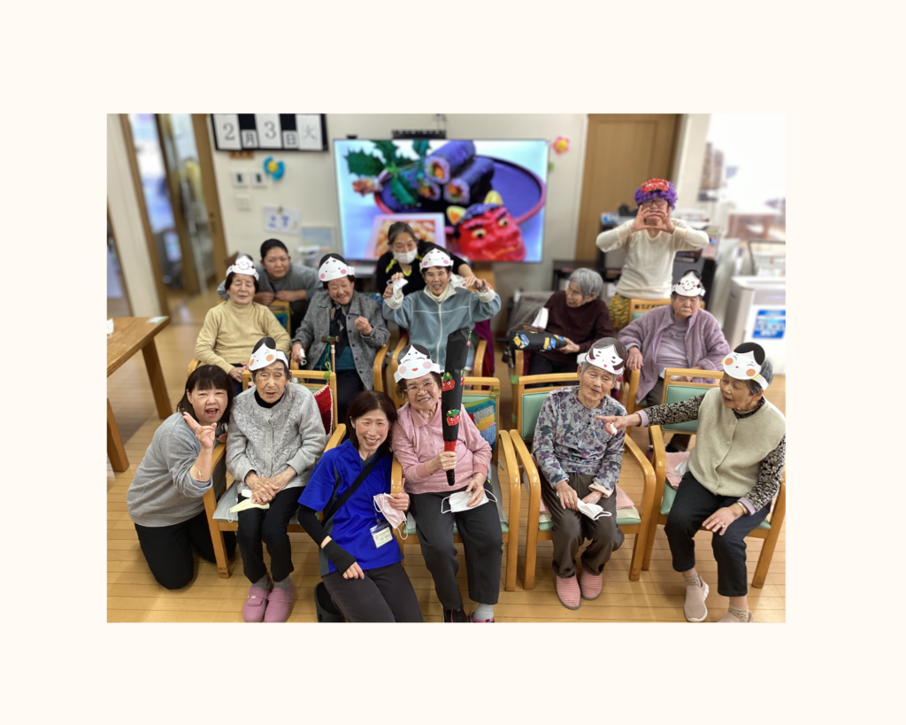 体調が優れずベッドで休まれていた方も、横になったまま「豆まき」の仕草で参加してくださり、最後は鬼と一緒に笑顔で記念撮影。皆さんの「やったー!万歳!」という晴れやかな声に、鬼も山へ退散していきました。