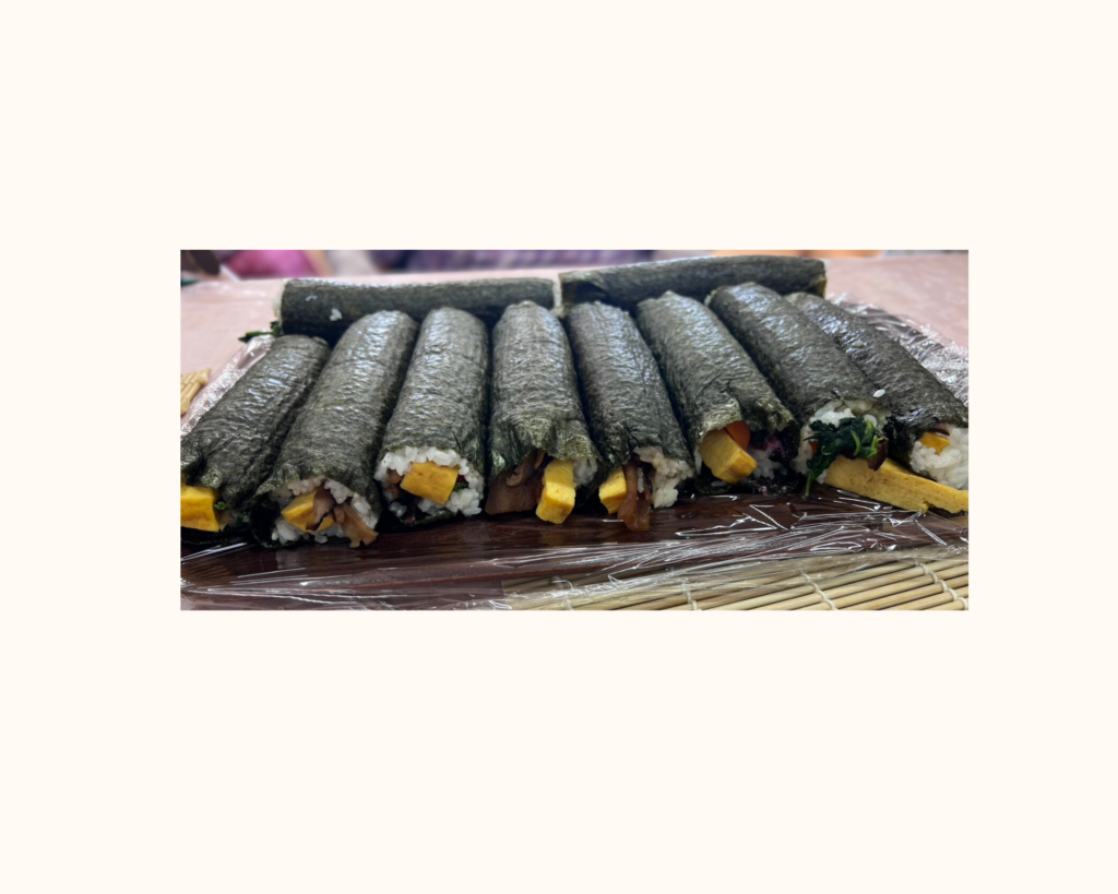 海苔の上にご飯をたっぷり乗せすぎて、玉子やシイタケを巻いたら規格外のジャンボ太巻きが完成!「これじゃ口に入らんね!」と大笑いしながら、個性豊かな巻き寿司たちが並びました。