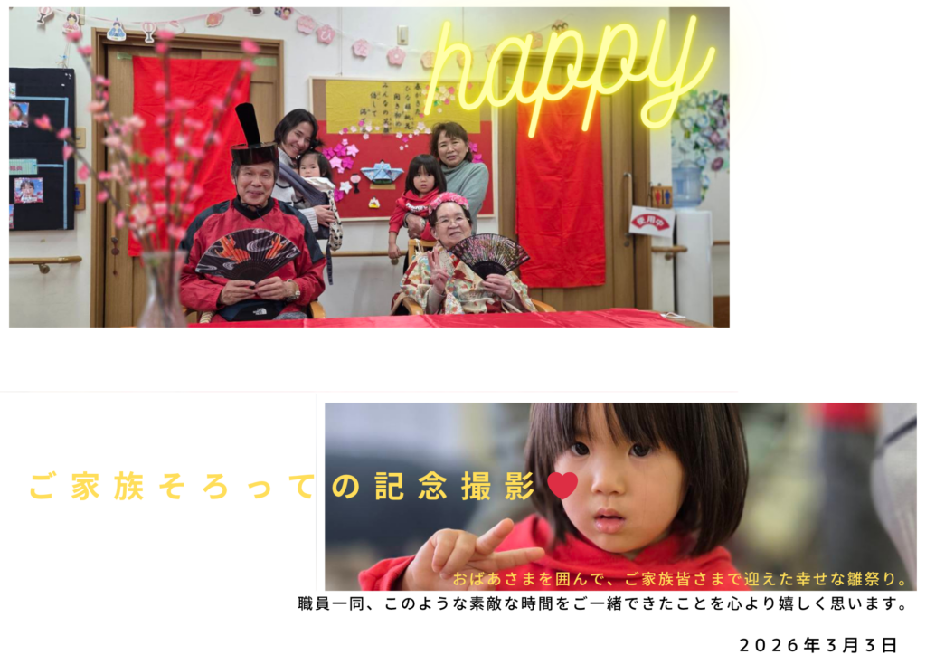 この日は、あるご利用者様のご家族(息子さんご夫婦、娘さん、そしてお孫さん)も駆けつけてくださいました。お雛様に扮したおばあちゃんの姿を見て、お孫さんが「おばあちゃん、可愛い!」と大喜び! その言葉を聞いたご本人も、本当に幸せそうな、満足気な表情を浮かべていらっしゃいました。
